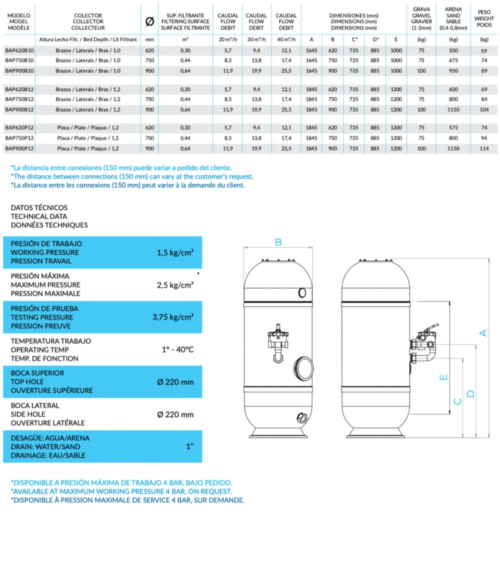 Filter diameters: 620, 750, and 900 mm. Includes pressure gauge and 2″ 6-way valve.