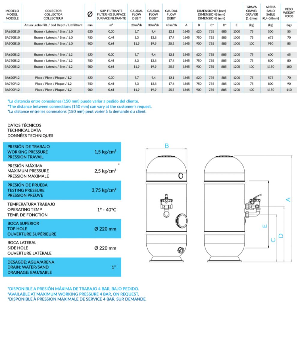 Filter for private pools, made with industrial standards, reinforced fibreglass tank, UV resistant treatment. With side hole and sightglass. 2” connection. Filters diameter: 620, 750 and 900mm. Includes pressure gauge and 6 ways multiport valve 2”. Bed depth: 1 metre. Versions with laterals or bottom nozzle plates, available.