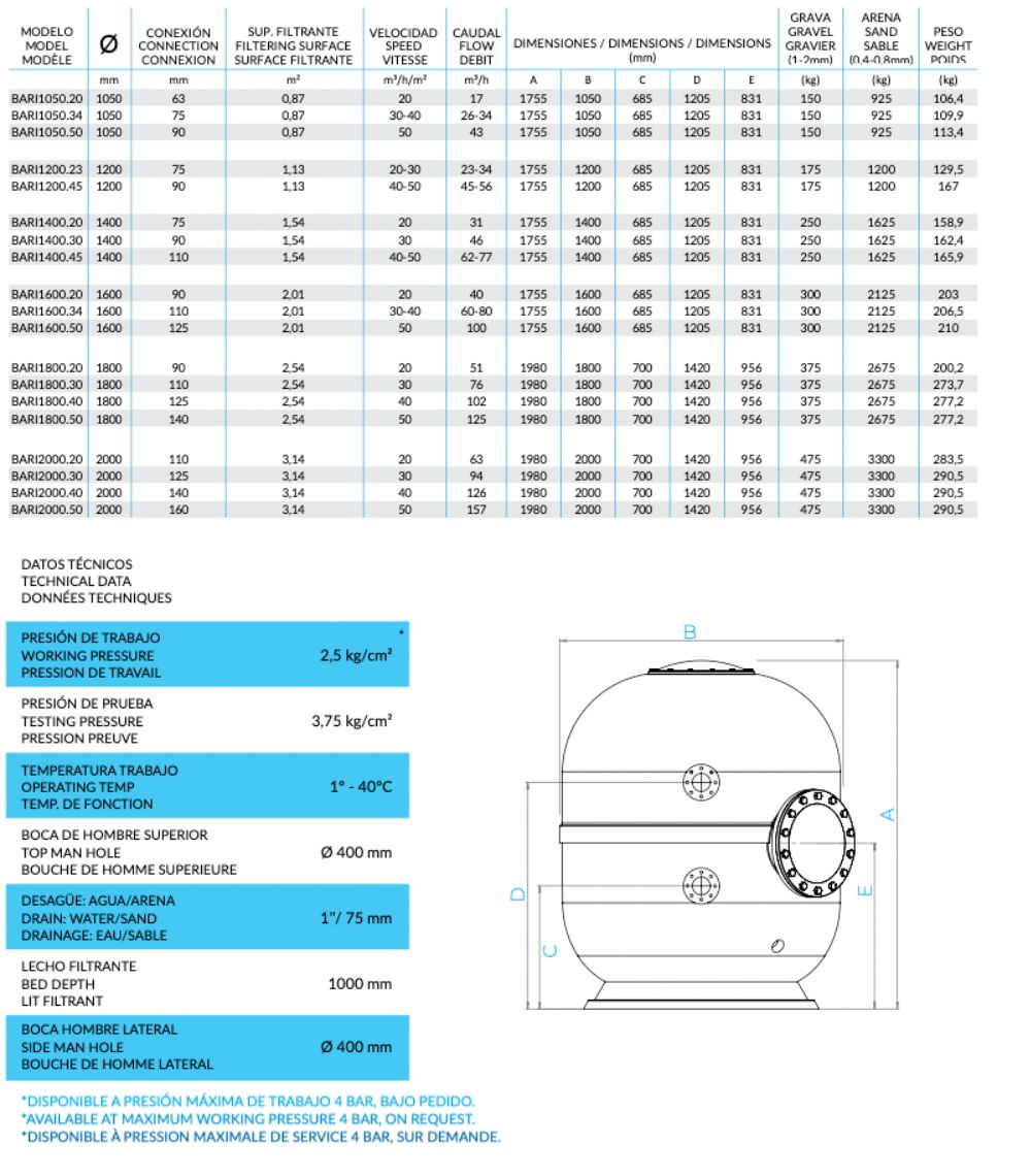 Commercial filters for public pools, made with industrial standards, reinforced fiberglass tank, UV resistant. Overpressure safety valve included. With nozzles bottom plate. Side manhole included. Top lid and side lid of 400mm made in reinforced fiberglass. Equipped as standard with overpressure safety valve and Side ManHole.
