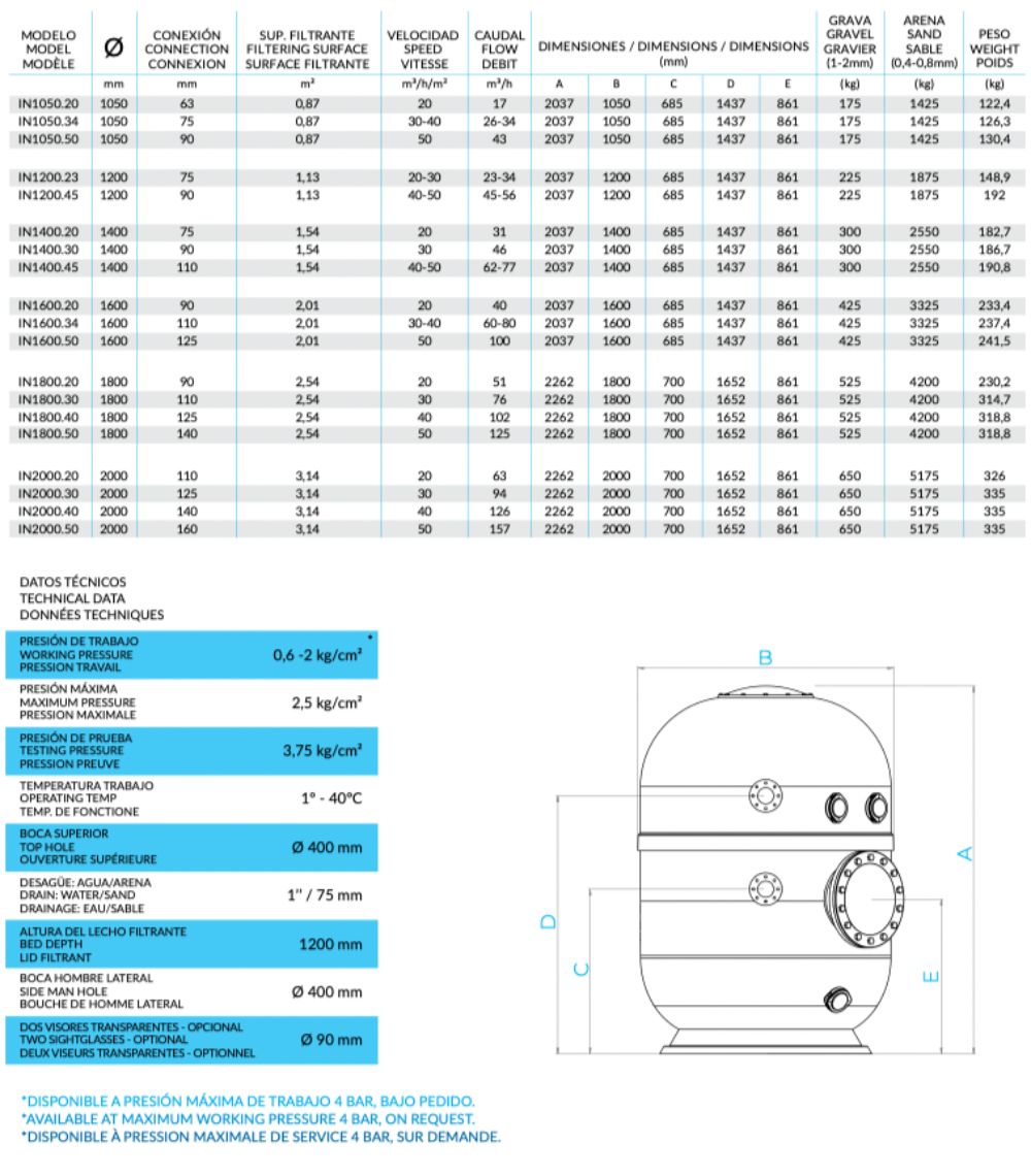 Commercial filters for public pools, made with industrial standards, reinforced fibreglass tank, UV resistant. Bottom with laterals. Side manhole. Top lid and side lid of 400mm made in reinforced fibreglass. Equipped as standard with overpressure safety valve.
