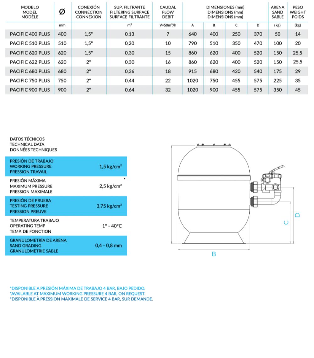 Filter for private pools, made with industrial standards, reinforced fiberglass tank, UV resistant treatment. Includes pressure gauge and 6 ways multiport valve.
