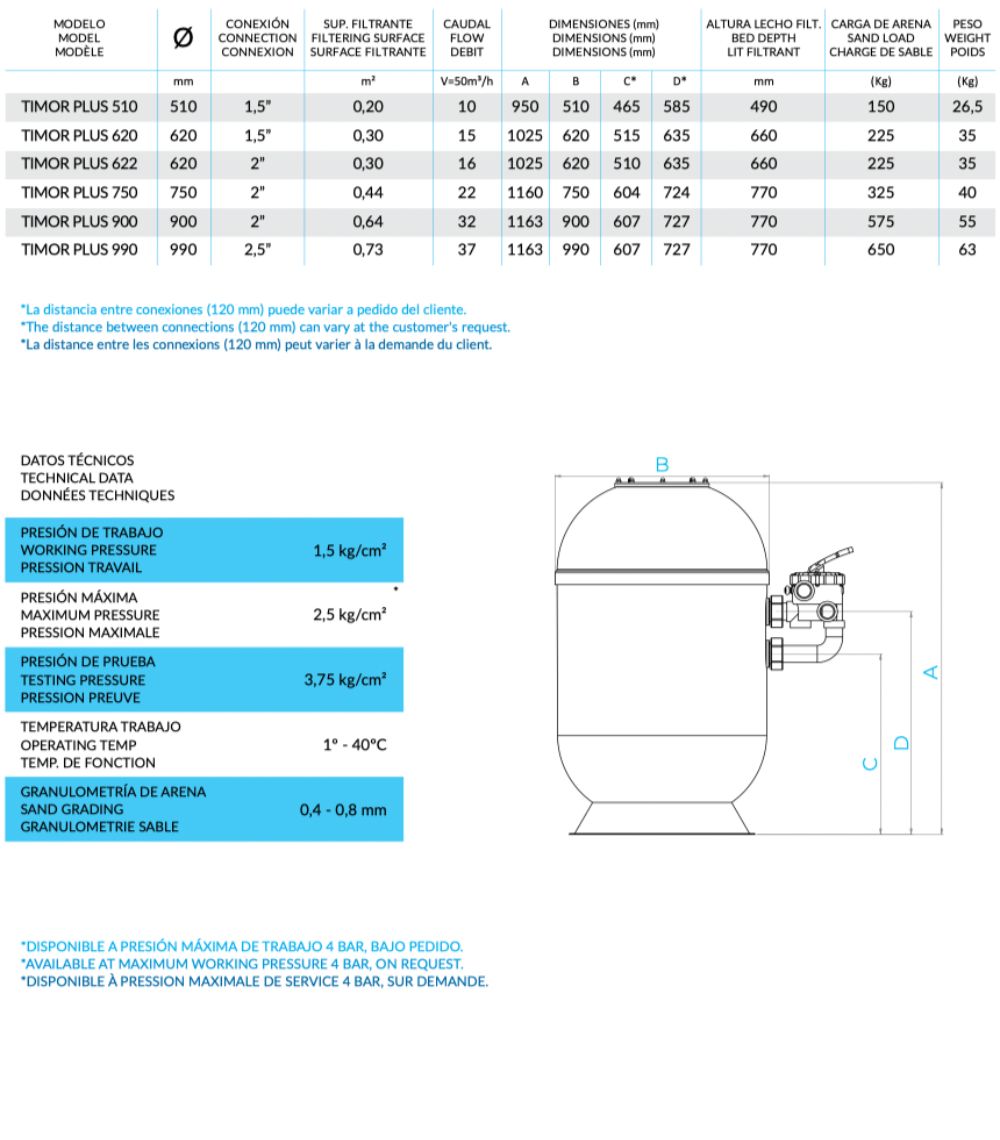 Filter diameters: 510, 620, 750, 900, and 990 mm. Includes a pressure gauge and a 6-way valve: 1 1/2″ for 510 and 620 mm diameters, 2″ for 620, 750, and 900 mm diameters, and 2.5″ for 990 mm diameter.